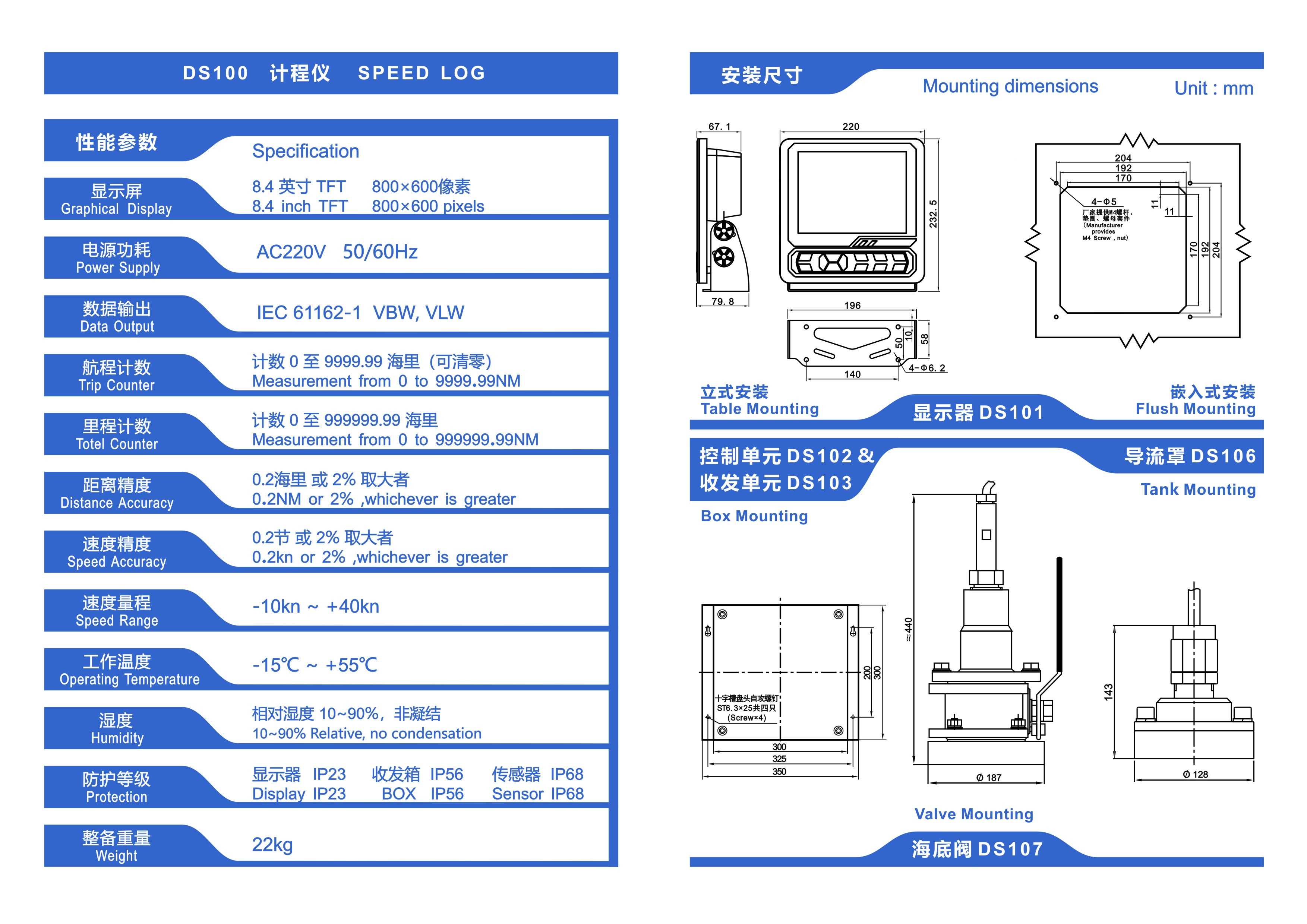 DS100 is a device that uses Doppler effect to measure the ship's speed and accumulated mileage relative to water. It uses eight-inch LCD to display longitudinal speed (forward and aft directions), current range and total mileage.